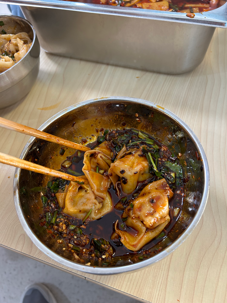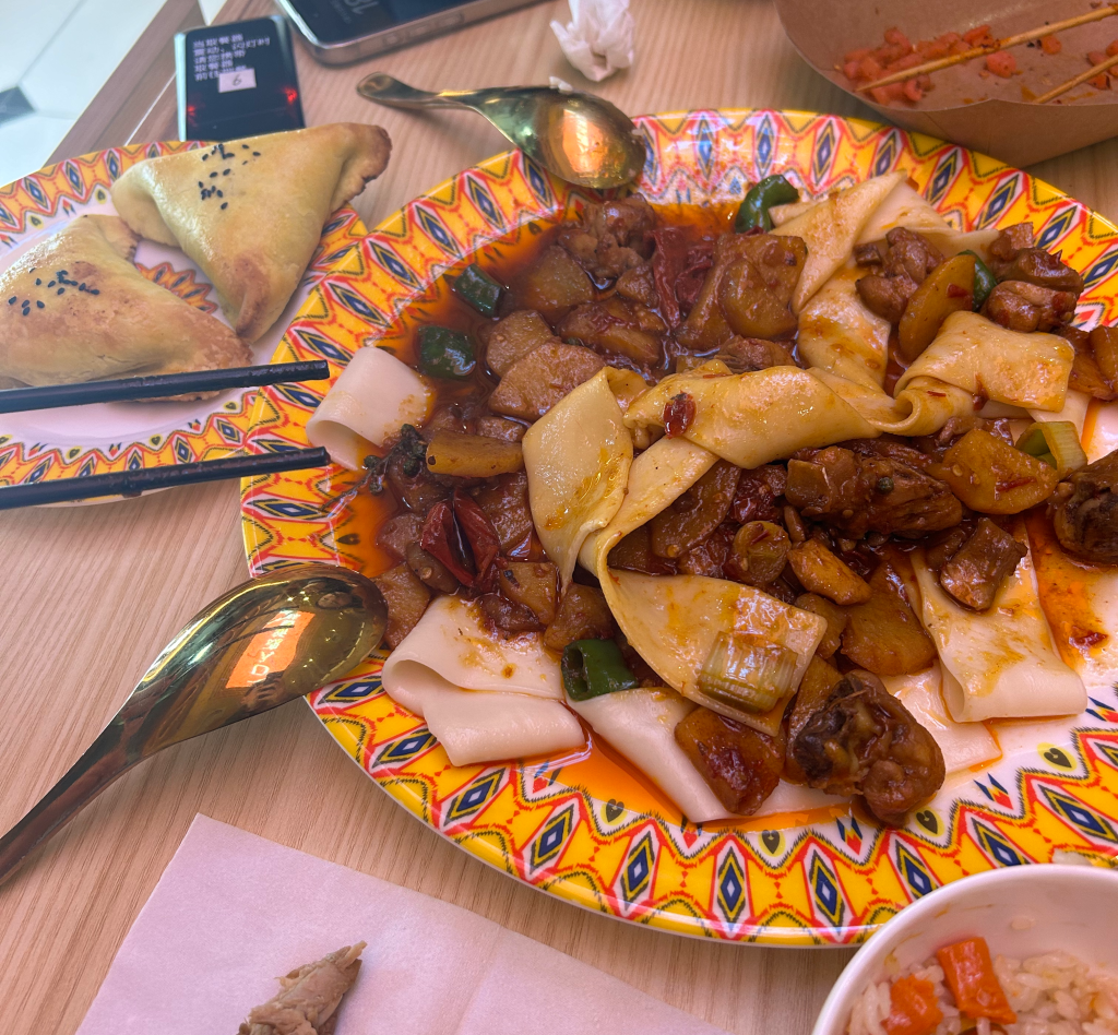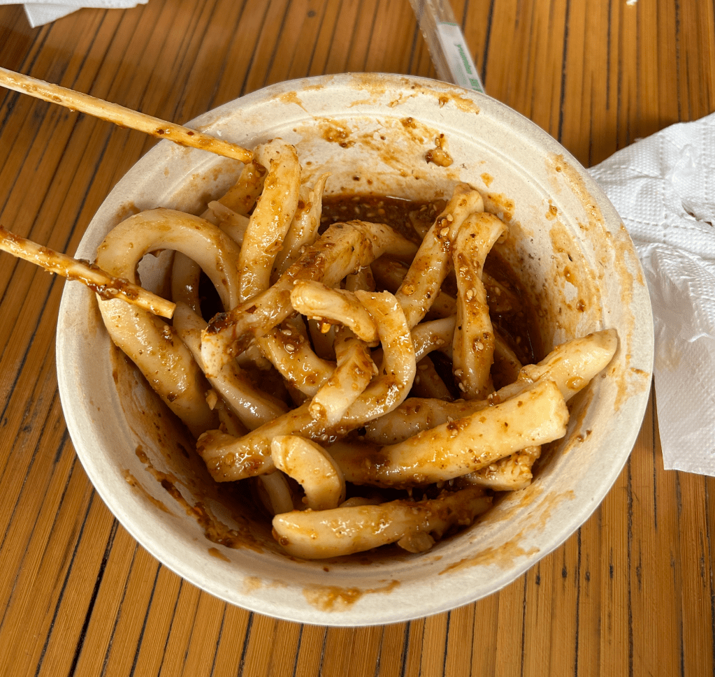 Shaanxi province’s famous Biang Biang noodles. Very wide, with beef, chili oil, carrots, garlic, and various other spices.