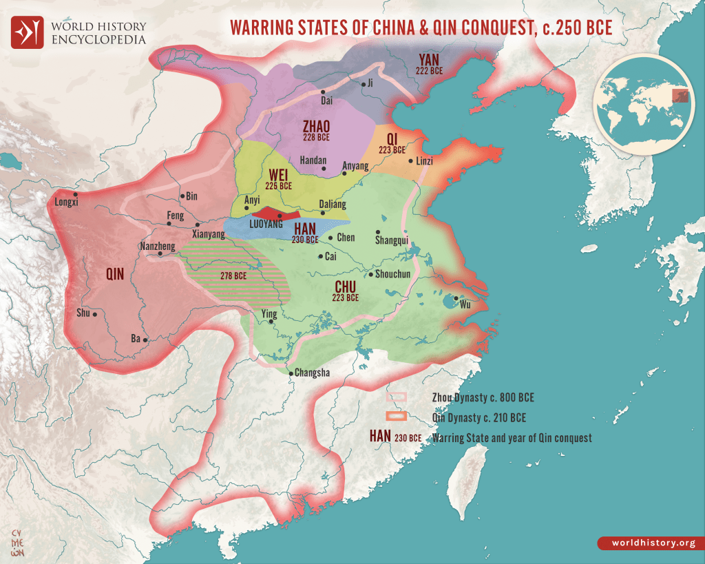 By the end, these warlords started to rebel and style themselves as independent kings (王, wang pronounced ‘wong’, meaning ‘king’, is the most common surname in China). Thus, the final centuries of the Zhou dynasty came to be known as the “Warring States period”.